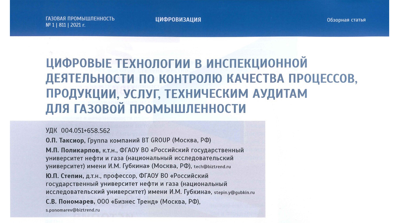 В журнале «Газовая промышленность», №1 за 2021 год, опубликована статья «Цифровые технологии в инспекционной деятельности по контролю качества процессов продукции, услуг, техническим аудитам для газовой промышленности»